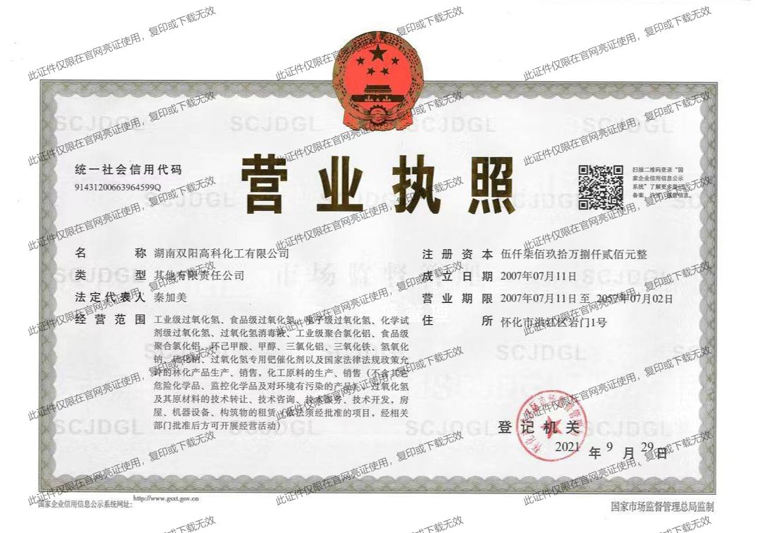 双阳高科是国家专精特新“小巨人”企业、国家高新技术企业、湖南省新材料企业、湖南省精细化工材料中试平台、湖南省智能制造标杆车间(湿化学品车间)、两化融合贯标标杆企业、湖南省绿色工厂、湖南省绿色制造体系示范单位、湖南省环境治理行业优秀企业、“湖湘精品”中小企业品牌能力提升标杆企业、中国双氧水行业优秀供应商,并在“创客中国”省级决赛中获二等奖,已通过ISO9001质量管理体系认证、环境管理体系认证和职业健康安全管理体系认证。